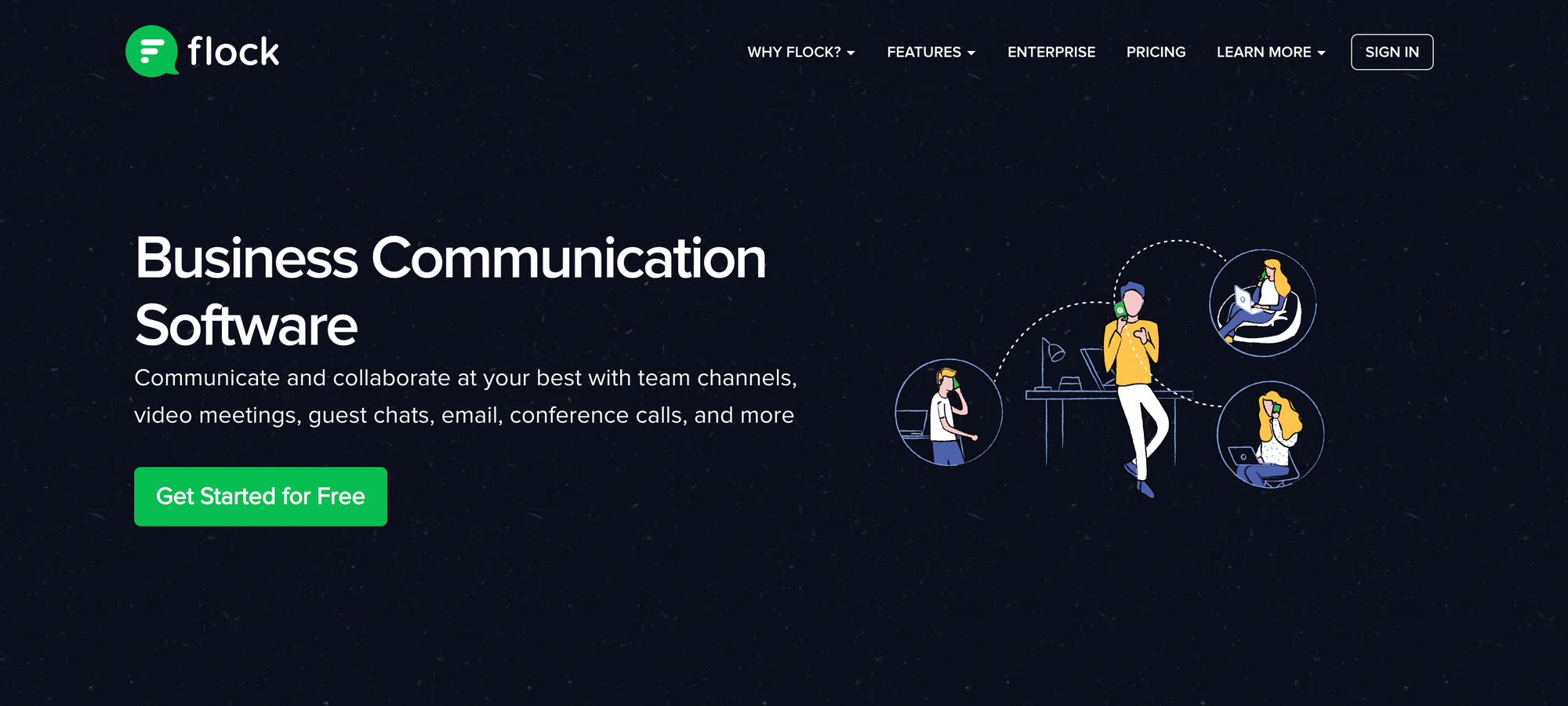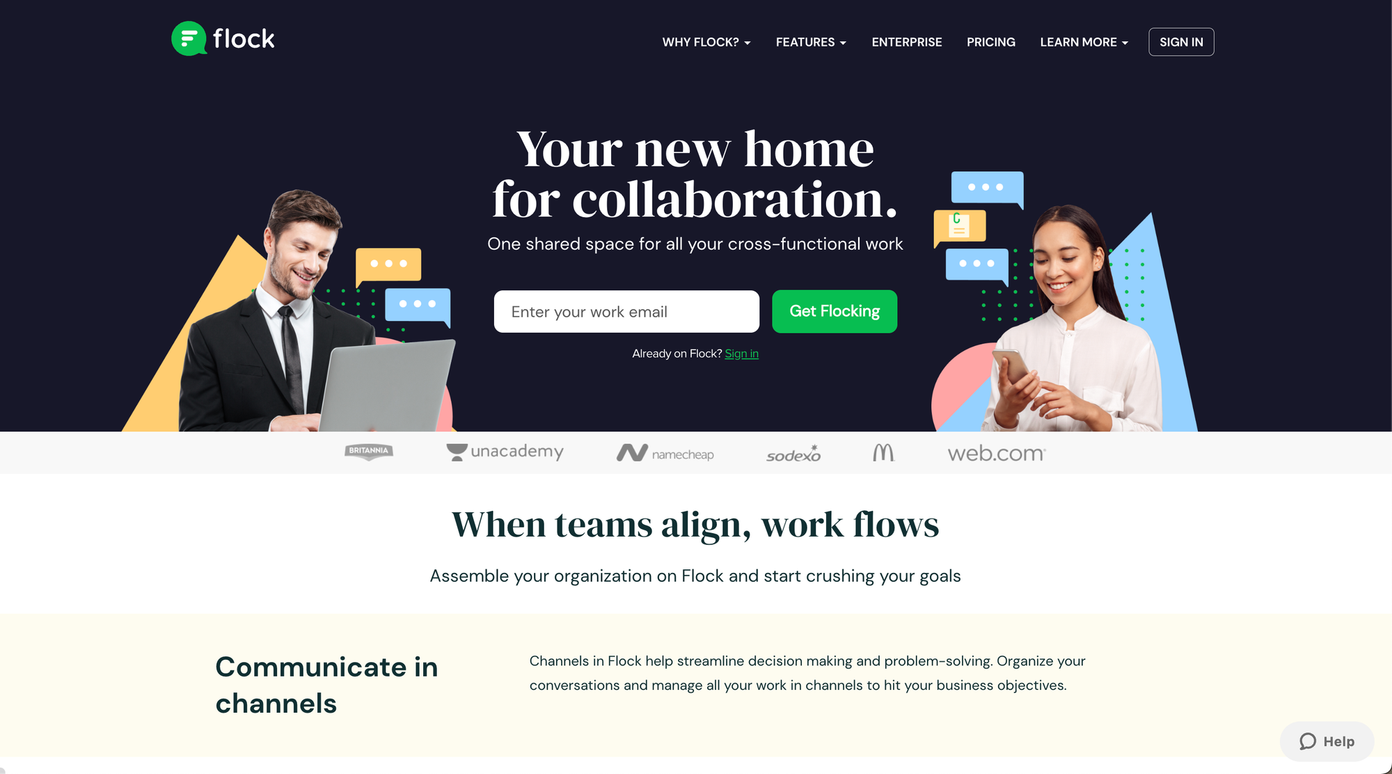 - Homepage: Instantly communicates Flock’s value with clear, engaging messaging and a strong call to action.